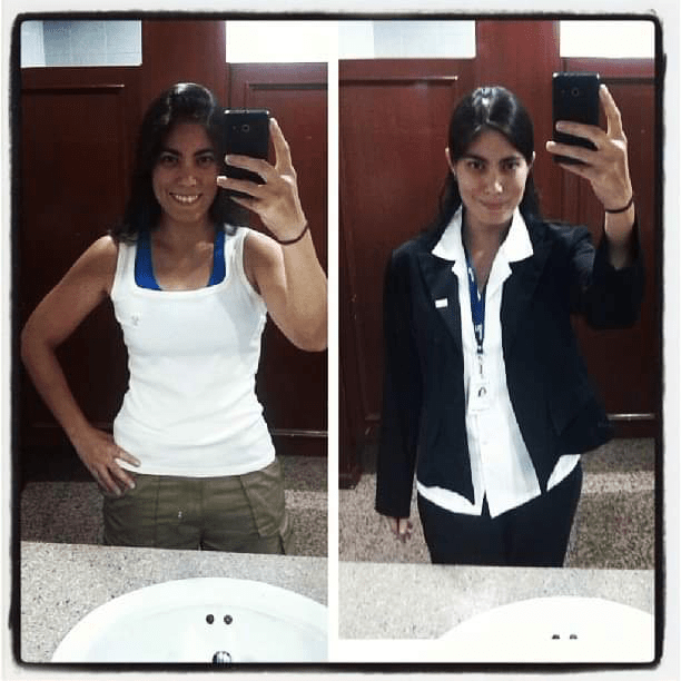 Diana Patiño muestra cómo llegaba al trabajo en bici (izquierda) y, sin problemas, se ponía el uniforme.