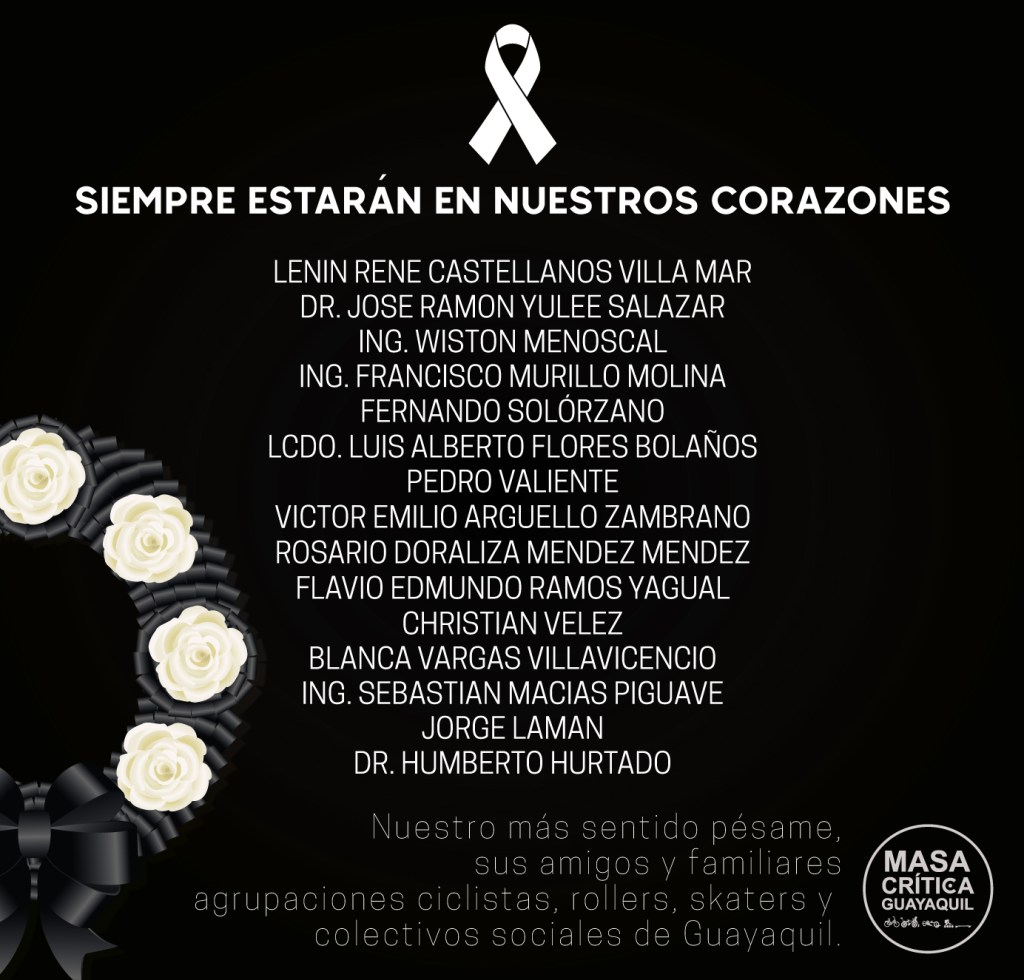Quienes conformamos la comunidad ciclista de Guayaquil expresamos nuestro pesar por quienes han fallecido debido a la pandemia de coronavirus. Personas que formaron parte de la lucha por tener una ciudad más amigable con los ciclistas o usuarios de vehículos de micromovilidad.
