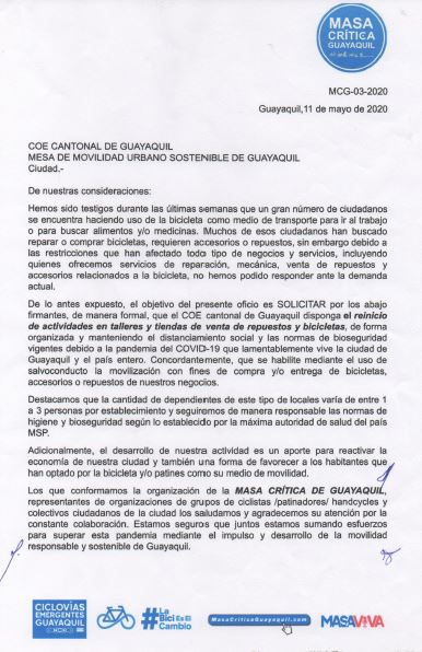 Al menos 26 propietarios de talleres y almacenes de venta de repuestos para bicicletas, se unieron a la iniciativa de Masa Crítica Guayaquil, para solicitar la reapertura de los establecimientos, ante la gran demanda de personas que desean adquirir o arreglar sus bicis.