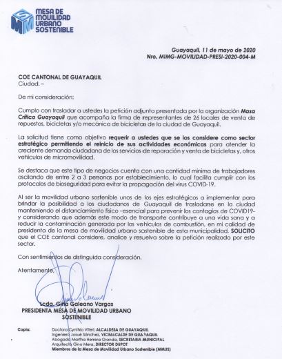 La presidenta de la MMUS, Gina Galeano, ofició al COE el pasado lunes. Solicitó que se acoja la propuesta de Masa Crítica: que se los considere como sector estratégico, permitiendo el reinicio de sus actividades económicas para atender la creciente demanda ciudadana de los servicios de reparación y venta de bicicletas y otros vehículos de micromovilidad.