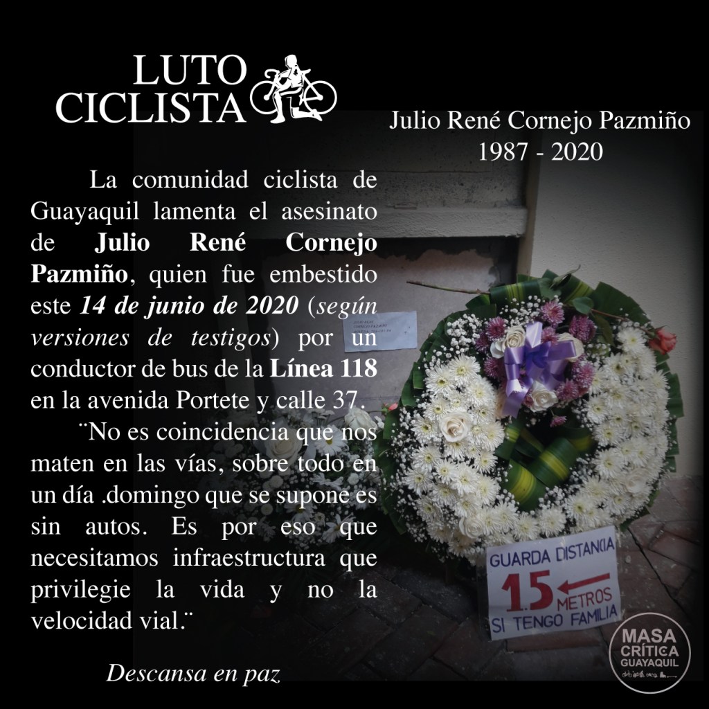 Nery Izquierdo Ramírez (14 de mayo de 2020) y Julio René Cornejo Pazmiño (14 de junio de 2020) son las dos víctimas más recientes de la imprudencia de conductores en las vías. Exceso de velocidad y falta de infraestructura vial están facilitando que peatones y ciclistas sean asesinados por automóviles y buses.