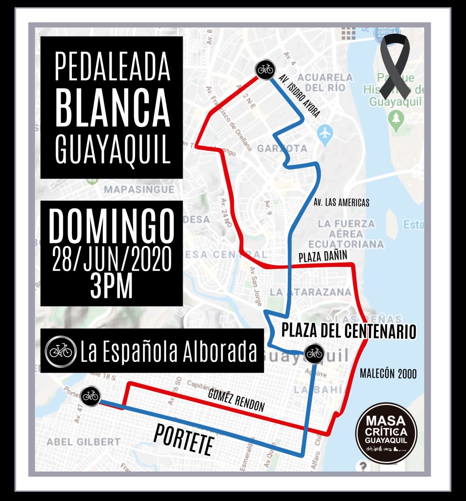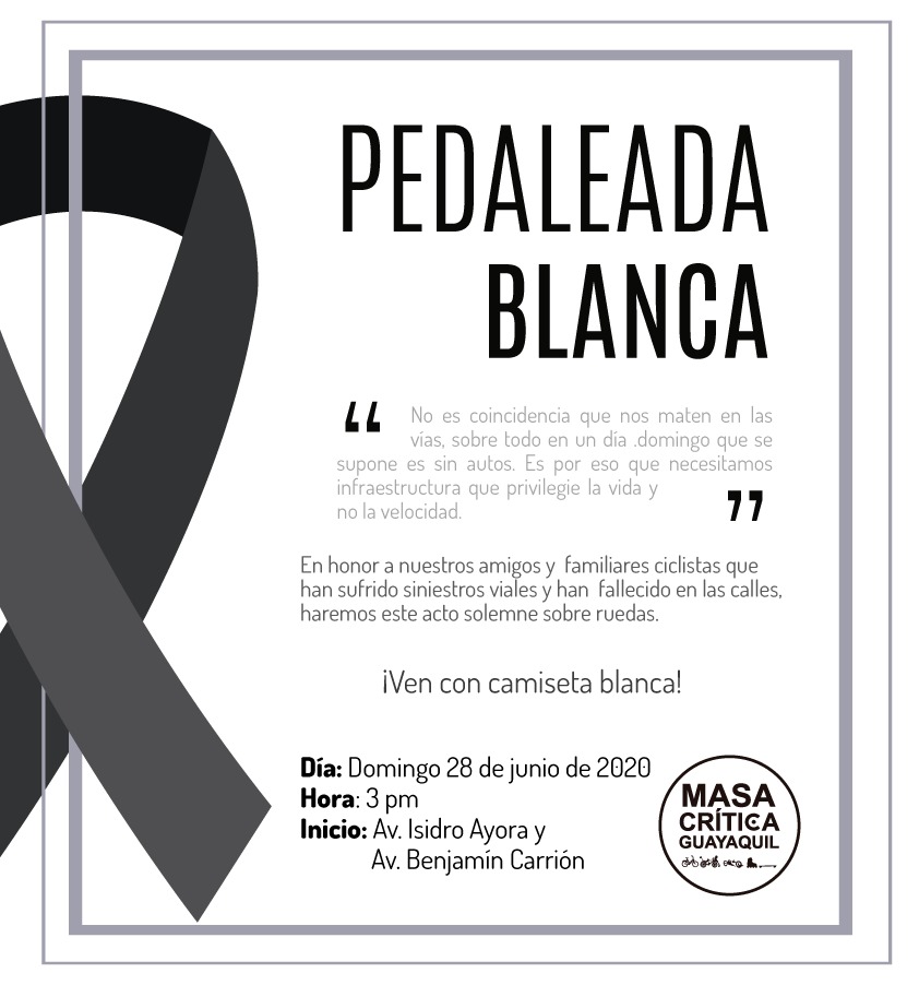 Por este motivo, Masa Crítica Guayaquil organiza una Pedaleada Blanca para este 28 de junio, como una forma de manifestar el rechazo de la comunidad ciclista a estos hechos que, lamentablemente por la omisión de las autoridades, terminan como simples estadísticas y no generan los cambios que necesitamos para tener una ciudad más segura y amigable con peatones y ciclistas.