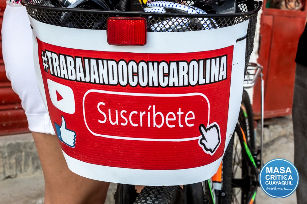 Visitamos a la profesora de la bicicleta en Playas (General Villamil, Guayas), donde reside y trabaja. Nos recibió obviamente con su bici, donde destaca el letrero #TrabajandoConCarolina, como promociona su canal de YouTube, donde sube recetas y contenido educativo.