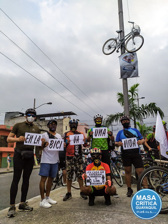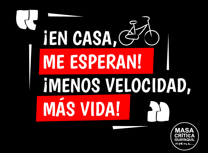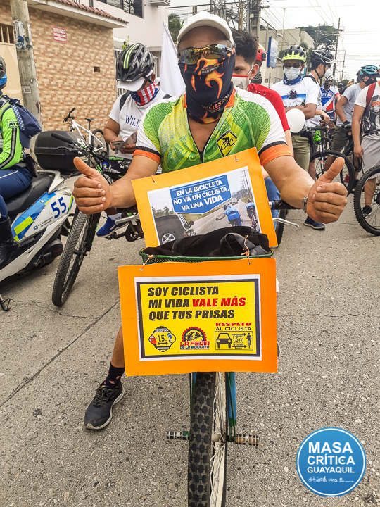 «Estamos en un lugar simbólico. Para quienes andamos en bicicletas y patines, para nuestra comunidad, aquí no se apagó una vida, aquí se afianzó nuestra lucha. Porque cuando subimos a nuestra bici o nos ponemos los patines, estamos cambiando el mundo. Somos parte de quienes deciden pasar a la acción y no solo quedarse viendo lo que pasa alrededor. Un conductor asesinó a Julio, así como cientos lo han hecho con familiares y amigos, no solo en Guayaquil sino en otras ciudades del país. Por ustedes es que seguimos pedaleando, por ustedes es que defendemos nuestro derecho a andar en una ciudad segura e incluyente. Por ustedes, nuestras familias y las nuevas generaciones es que exigimos al Municipio de Guayaquil y la Autoridad de Tránsito Municipal que construyan infraestructura vial para ciclistas, y que la hagan respetar, como se establece en la Ley de Tránsito. No pedimos privilegios, exigimos derechos, no solo para quienes pedaleamos y patinamos, sino para toda persona que camina en familia, que tiene movilidad reducida, y que no merece ser atropellada y abandonada en la vía como si fuera un objeto, por parte de conductores cobardes. Por eso exigimos a la Asamblea Nacional que modifique la Ley de Tránsito con enfoque de educación vial y no solo sancionador para peatones y ciclistas sino con penas más severas para quien causa el siniestro y encima huye. Masa Crítica Guayaquil les agradece por estar aquí, por ser parte de esta lucha, le agradece a la familia de Julio, y les expresamos nuestra admiración y respeto por involucrarse en este homenaje. Esta bicicleta blanca nos recordará que la vida debe respetarse, que la vida es prioridad antes que la velocidad, nos recordará hoy y siempre que #LaBiciSeRespeta. ¡Viva la bici!».
