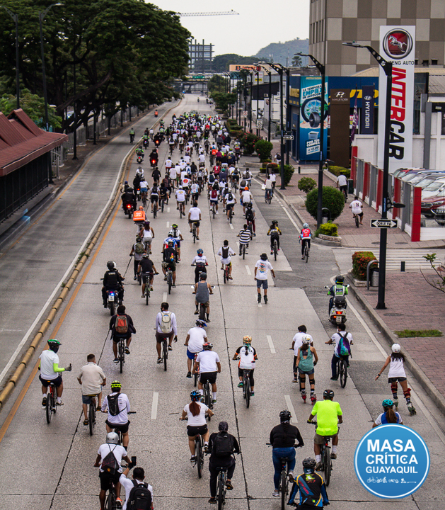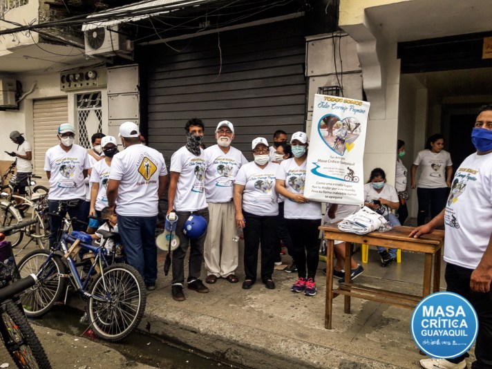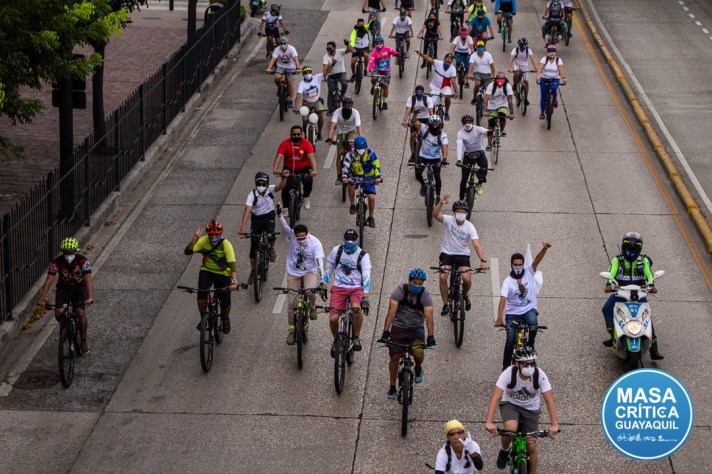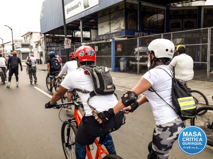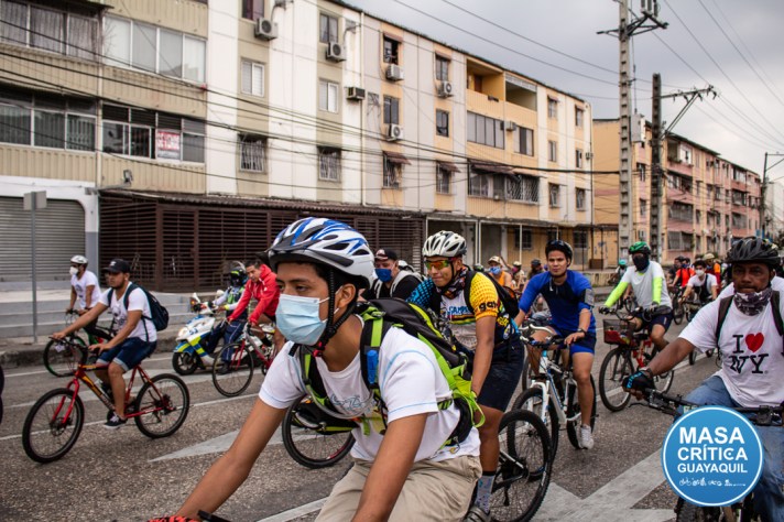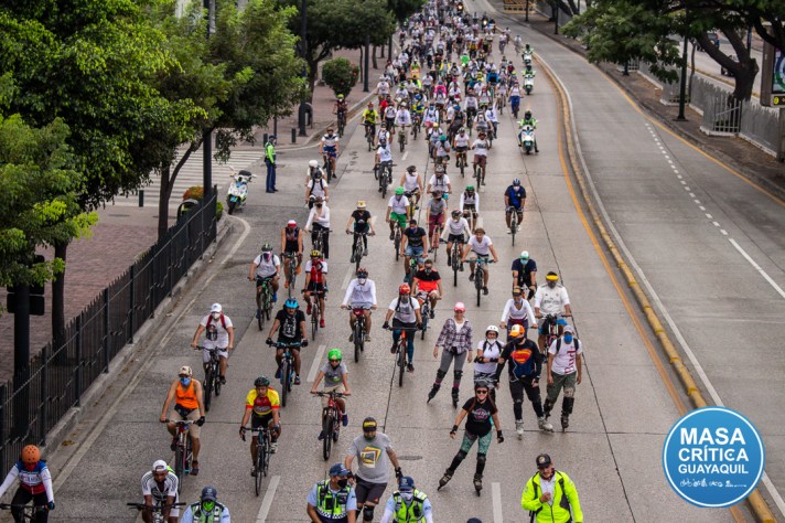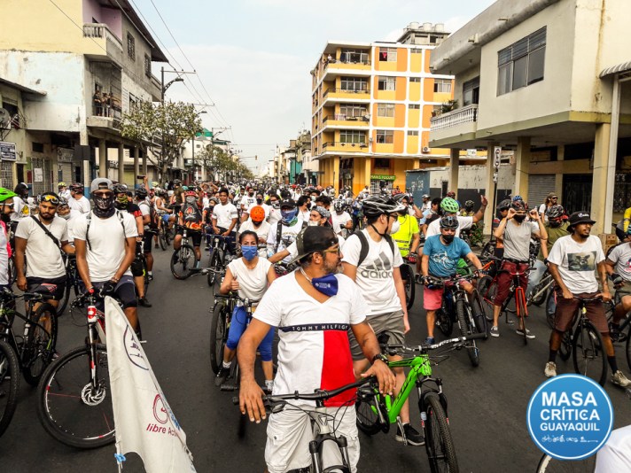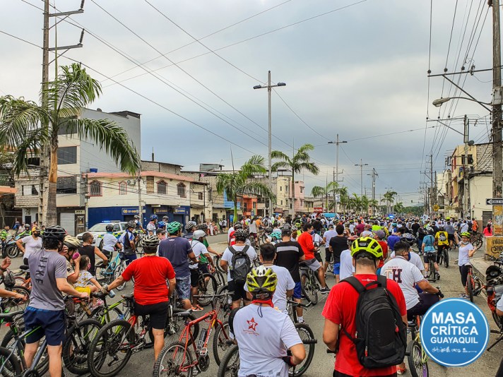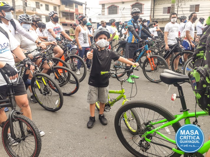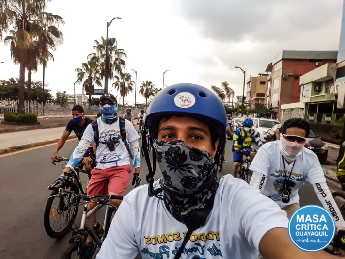 Salimos desde el norte de Guayaquil y avanzamos hasta la Plaza del Centenario, punto icónico de la comunidad ciclista, donde ha sido el lugar de concentración de Masa Crítica. Esta fue nuestra segunda pedaleada desde que empezó la pandemia, por lo que las personas asistieron con mascarillas.