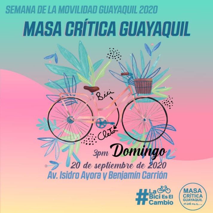 15:00 a 17:00 Como parte de la Recreovía haremos nuestra Masa Crítica de septiembre. Nos concentraremos en Isidro Ayora y Benjamín Carrión. Recuerda que el uso de mascarilla y el distanciamiento físico son obligatorios.