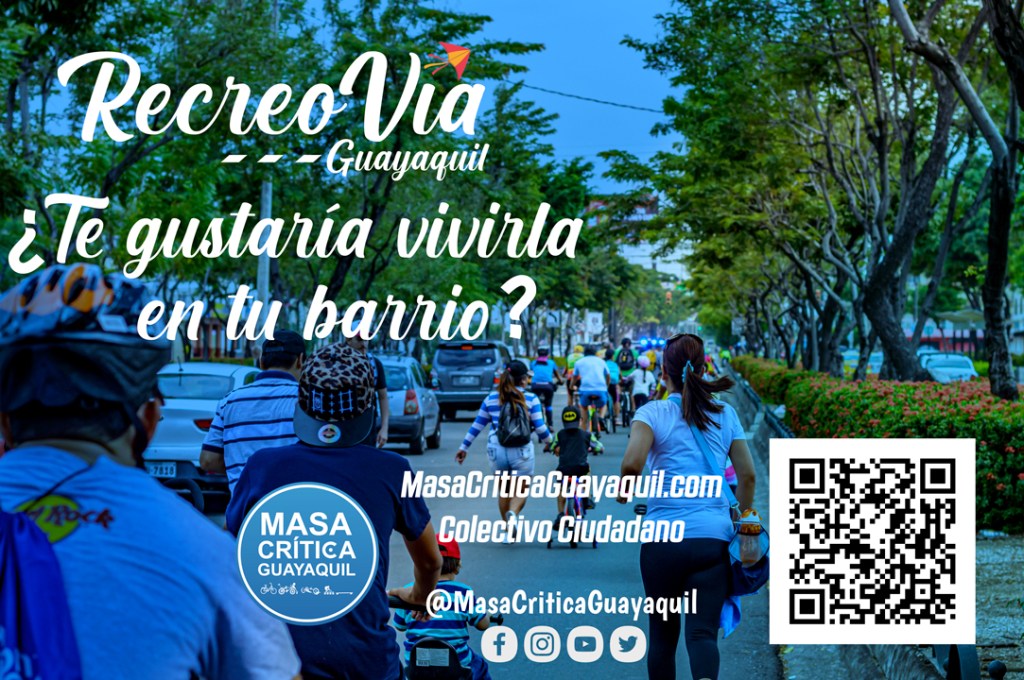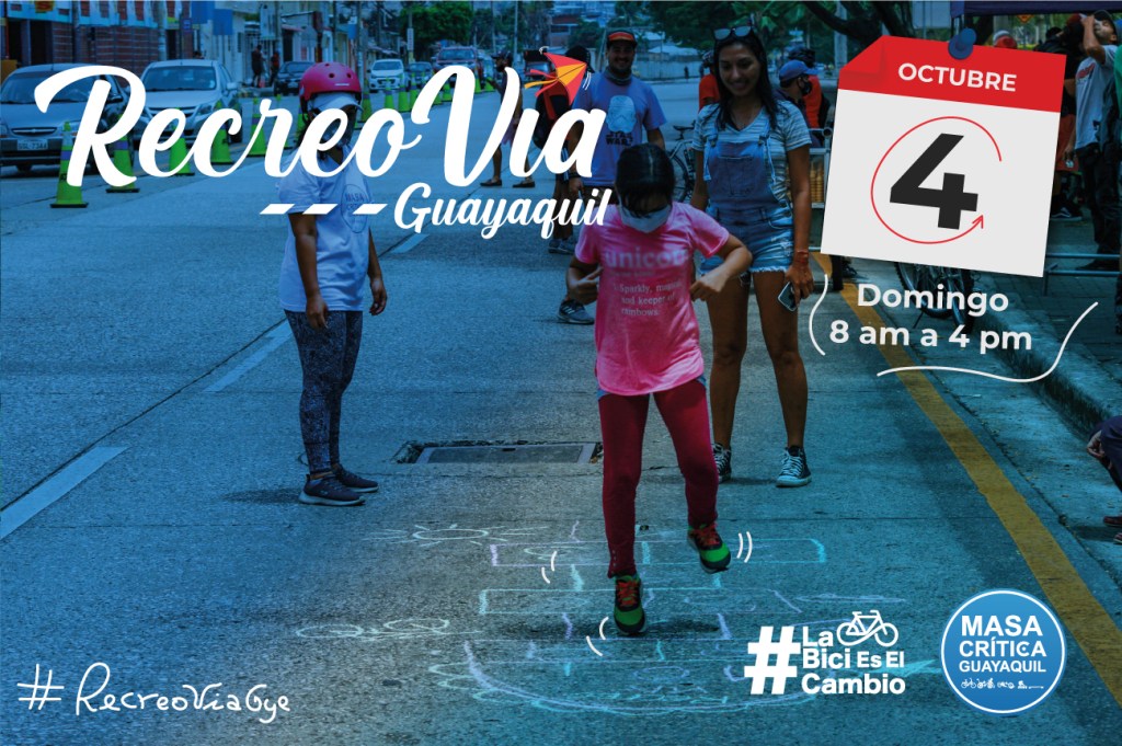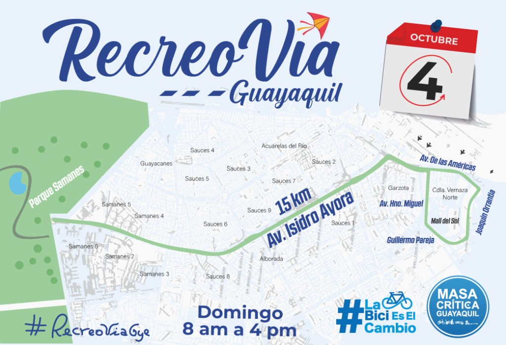 Nuestra Recreovía vuelve este 4 de octubre al norte de Guayaquil. Tal como establece el artículo 19 de la Ordenanza para el uso de la bicicleta y vehículos de micromovilidad, se realiza este evento para la recuperación del espacio público y generar mejores condiciones de vida para quienes habitan la ciudad.