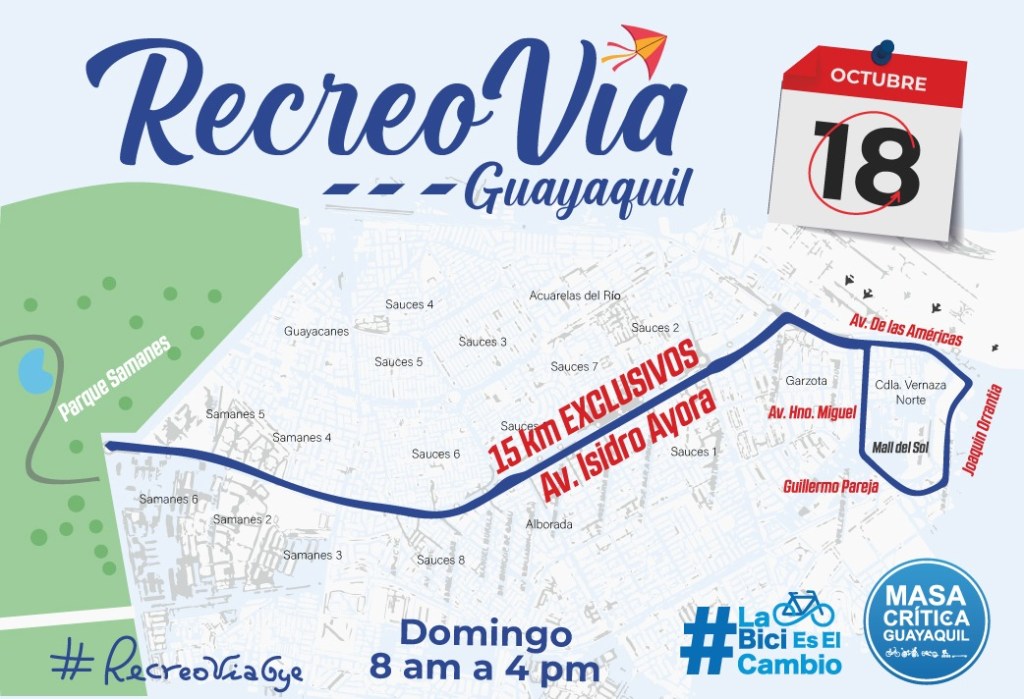 Nuestra Recreovía vuelve este 18 de octubre al norte de Guayaquil. Tal como establece el artículo 19 de la Ordenanza para el uso de la bicicleta y vehículos de micromovilidad, se realiza este evento para la recuperación del espacio público y generar mejores condiciones de vida para quienes habitan la ciudad.