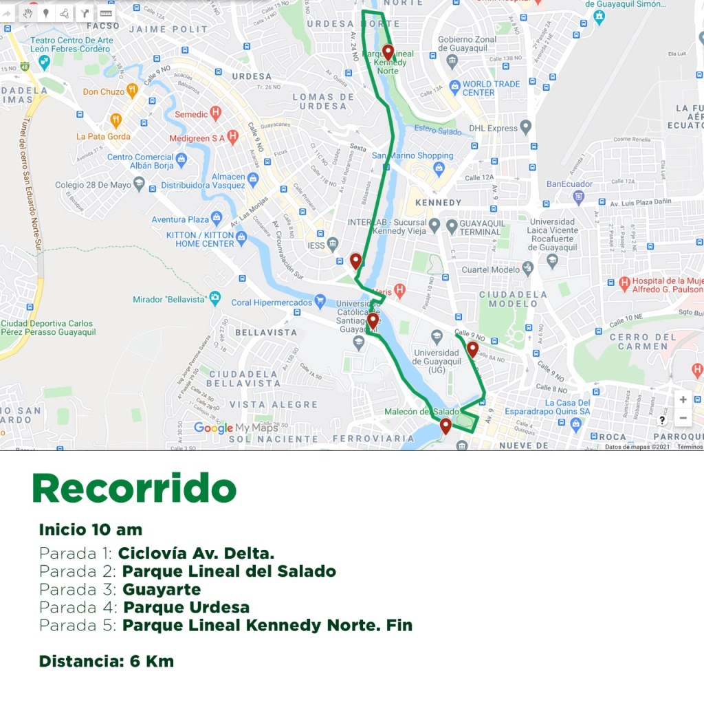 La pedaleada en Guayaquil comenzará a las 10:00 desde la ciclovía de la avenida Delta, junto a la Ciudadela Universitaria. Será un recorrido de seis kilómetros, dirigido a personas de todas las edades: niños, jóvenes, adultos y adultos mayores.
