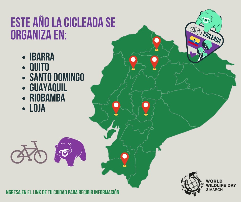 Este 3 de marzo se celebra el Día Mundial de la Vida Silvestre. En Ecuador se ha organizado una cicleada que se realizará, de manera simultánea, en seis ciudades. El tema de la actividad será: Los Bosques y Los Medios de Subsistencia: sustentar a las personas y preservar el planeta.