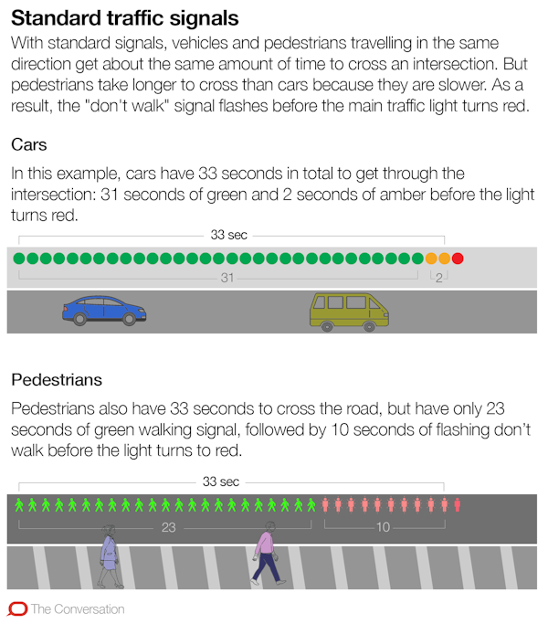 La norma estándar señala que los vehículos y peatones, que viajan en la misma dirección, tienen aproximadamente el mismo tiempo para cruzar una intersección. Pero los peatones tardan más en cruzar las calles que los automóviles, porque son más lentos. Como resultado, la señal de «no caminar» (que indica que el peatón ya no debe estar en la calle) parpadea antes de que el semáforo principal se ponga en rojo (cuando los autos aún están rodando).