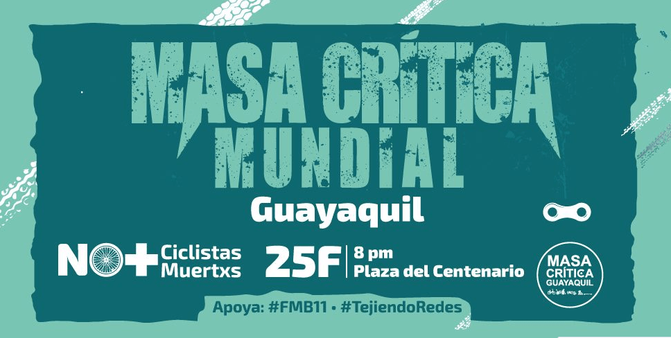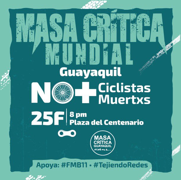 «No más ciclistas muertos» es el lema de la Masa Mundial de este 2022. Guayaquil se une a esta iniciativa con la rodada que haremos este viernes, desde las 20:00. Concentraremos en la Plaza del Centenario (9 de Octubre y Lorenzo de Garaycoa).