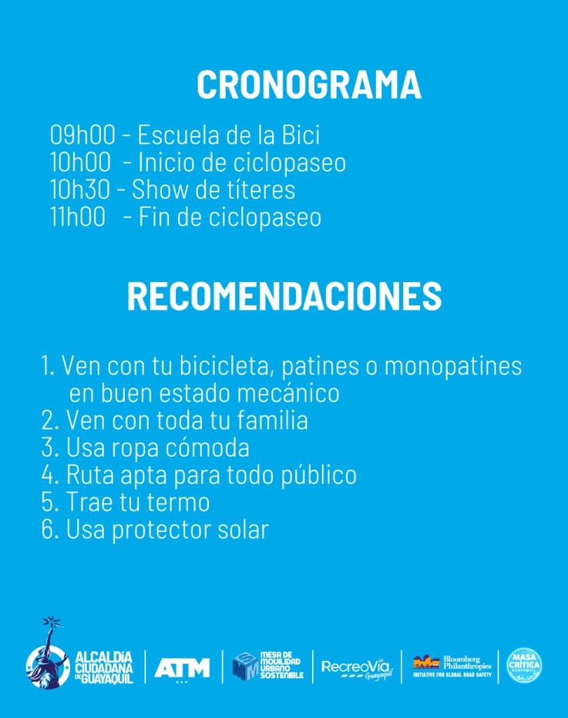 Las niñas, niños y adolescentes podrán pedalear y patinar junto a sus familias en una jornada segura, que contará con la colaboración de la Agencia de Tránsito y Movilidad (ATM). Recomendamos usar ropa cómoda y adecuada, gorra y bloqueador. También es importante la hidratación.