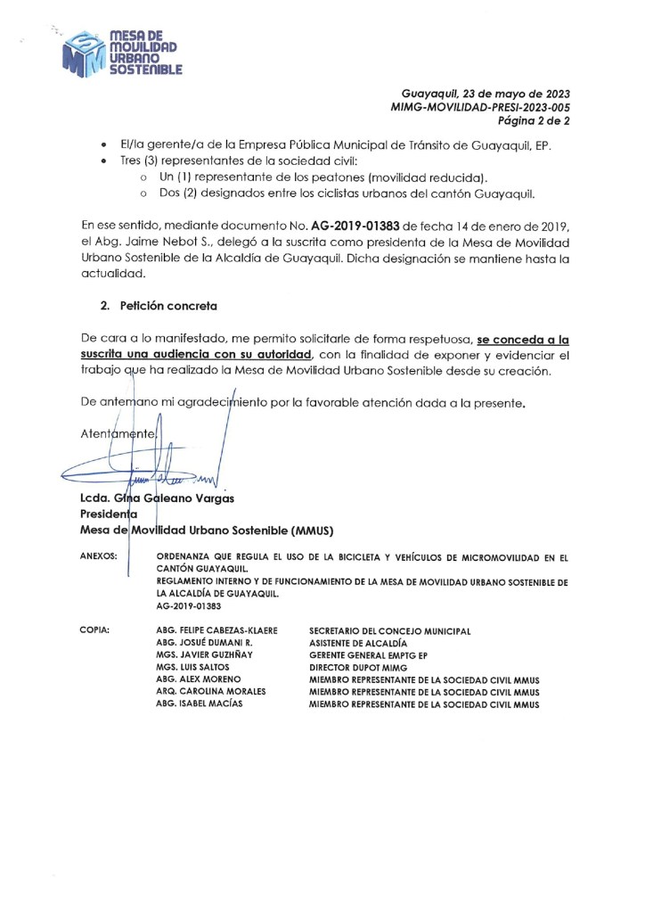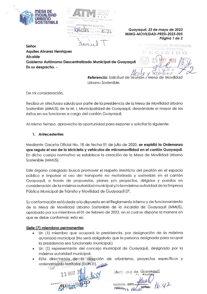 La administración municipal de Aquiles Álvarez ya tiene más de tres meses de posesionada y uno de los temas pendientes es que se retome la actividad en la Mesa de Movilidad Urbano Sostenible (MMUS), establecida en nuestra Ordenanza para el uso de la bicicleta y vehículos de micromovilidad.