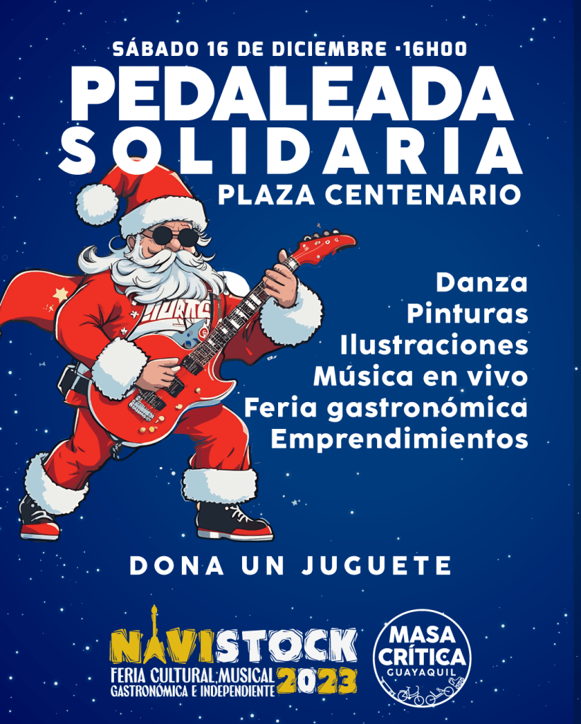 Vamos a vivir en bicicletas y patines la fiesta de este 16 de diciembre. Concluiremos en el Navistock en Sauces 2, donde disfrutaremos de música en vivo, gastronomía, danza, pinturas, ilustraciones, feria gastronómica y emprendimientos.